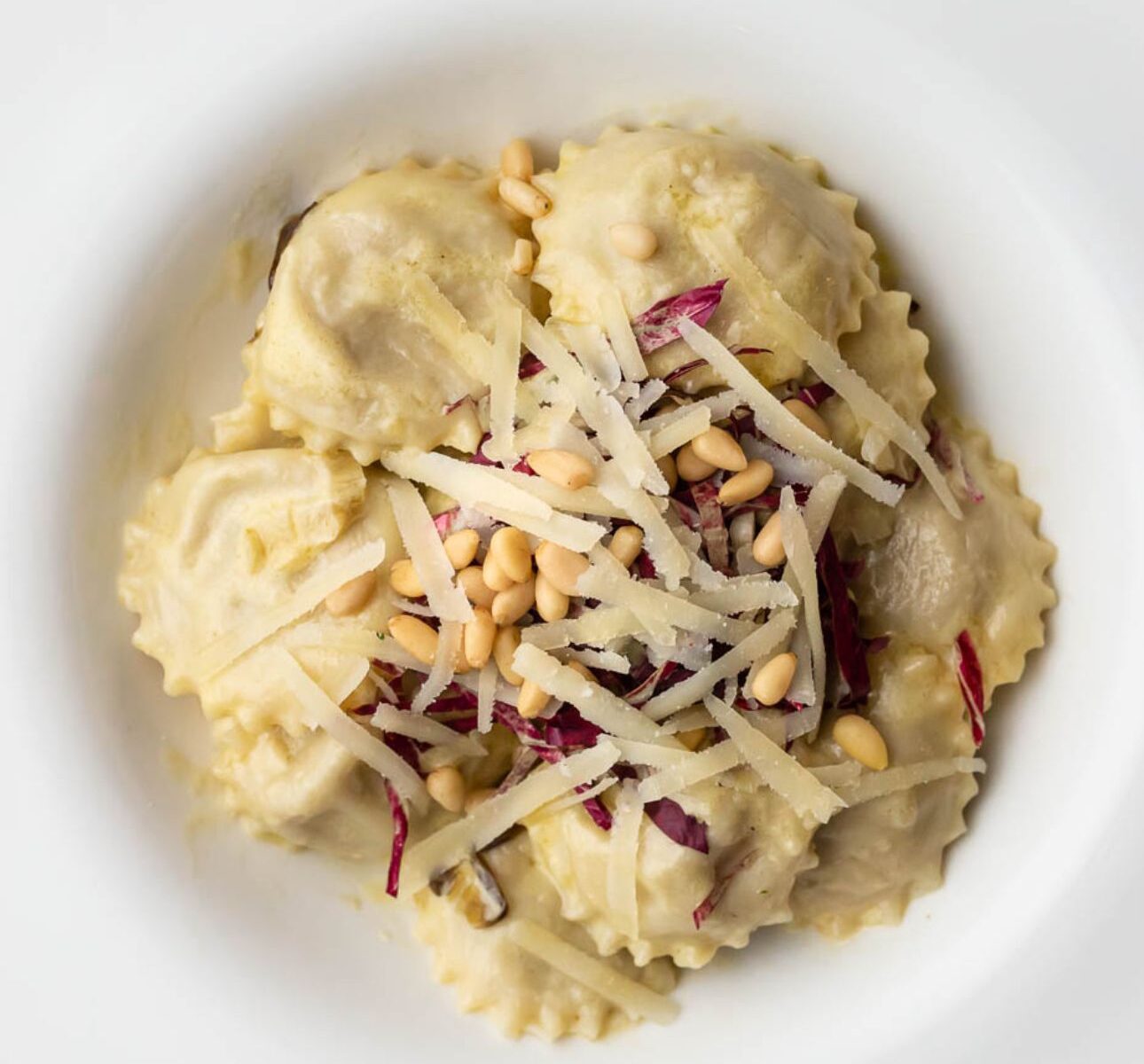 Rellenos de Queso Ricotta y Mascarpone, Hongos Porcini y Trufa Blanca en Salsa de Crema al Parmesano, Radicchio y Piñones